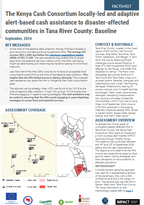 The Baseline Assessment for Locally-Led and Adaptive Alert-Based Cash Assistance to Disaster-Affected Communities in Tana River County was implemented by the Kenya Cash Consortium (KCC) to assess household well-being before the rollout of a multi-purpose cash transfer (MPCT) intervention. Conducted between 16–20 September 2024 by IMPACT Initiatives, the survey covered 228 households in Garsen West Ward, Tana River County, using a simple random sampling approach with a 95% confidence level and 5% margin of error. The baseline measured income, expenditure, food security, coping strategies, and accountability to affected populations.