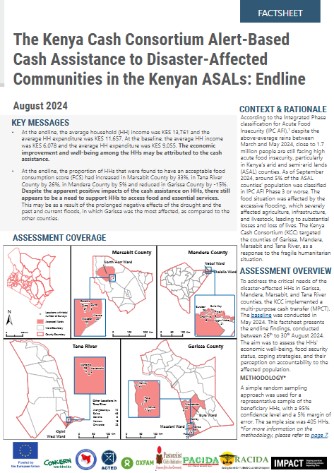 The Alert-Based Cash Assistance to Disaster-Affected Communities in Kenya’s Arid and Semi-Arid Lands (ASAL) project was implemented by the Kenya Cash Consortium (KCC) to mitigate the impact of drought and flooding in Garissa, Mandera, Marsabit, and Tana River counties. The endline assessment, conducted by IMPACT Initiatives in August 2024, surveyed 405 households using a random sampling approach with a 95% confidence level and 5% margin of error. The objective was to measure household income, expenditure, food security, and accountability outcomes following the delivery of multi-purpose cash transfers (MPCT).