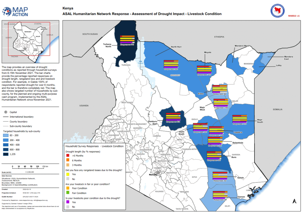 ASAL Humanitarian Network – Drought Impact Assessment Agricultural Impact Assessment – February 2022 This analytical map, developed by MapAction in collaboration with the ASAL Humanitarian Network (AHN) and REACH Initiative, visualizes household survey data on drought duration, rangeland degradation, and livestock condition across Kenya’s Arid and Semi-Arid Lands (ASALs). The survey was conducted between 6 […]